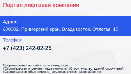 Портал, лифтовая компания по адресу 690002, Приморский край, Владивосток, Отлогая, 10 в дальнейшем Организация, размещена в следующих категориях: