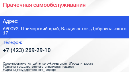 Прачечная самообслуживания по адресу 690092, Приморский край, Владивосток, Добровольского, 17 в дальнейшем Организация, размещена в следующих категориях: