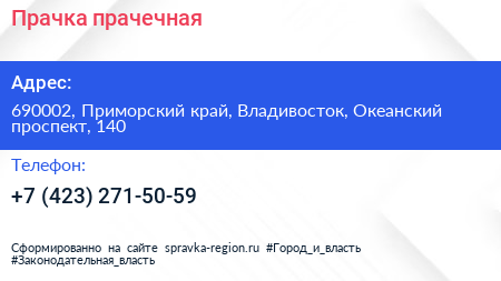 Прачка, прачечная по адресу 690002, Приморский край, Владивосток, Океанский проспект, 140 в дальнейшем Организация, размещена в следующих категориях: