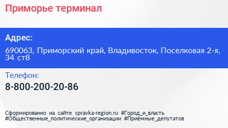 Приморье, терминал по адресу 690063, Приморский край, Владивосток, Поселковая 2-я, 34 ст8 в дальнейшем Организация, размещена в следующих категориях: