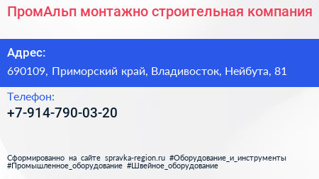 ПромАльп, монтажно-строительная компания по адресу 690109, Приморский край, Владивосток, Нейбута, 81 в дальнейшем Организация, размещена в следующих категориях:
