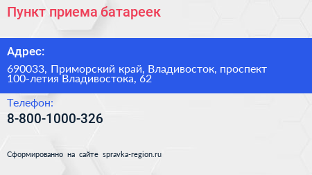 Пункт приема батареек по адресу 690033, Приморский край, Владивосток, проспект 100-летия Владивостока, 62 в дальнейшем Организация, размещена в следующих категориях: