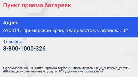 Пункт приема батареек по адресу 690011, Приморский край, Владивосток, Сафонова, 32 в дальнейшем Организация, размещена в следующих категориях: