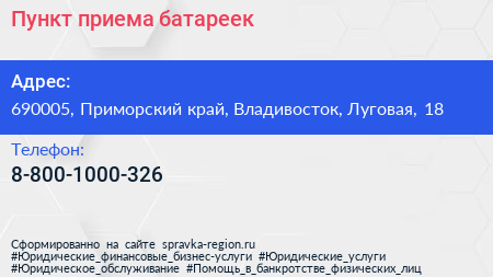 Пункт приема батареек по адресу 690005, Приморский край, Владивосток, Луговая, 18 в дальнейшем Организация, размещена в следующих категориях: