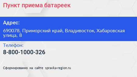 Пункт приема батареек по адресу 690078, Приморский край, Владивосток, Хабаровская улица, 8 в дальнейшем Организация, размещена в следующих категориях:
