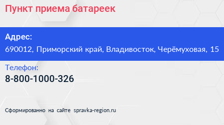 Пункт приема батареек по адресу 690012, Приморский край, Владивосток, Черёмуховая, 15 в дальнейшем Организация, размещена в следующих категориях:
