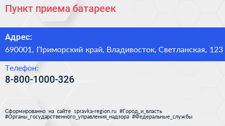 Пункт приема батареек по адресу 690001, Приморский край, Владивосток, Светланская, 123 в дальнейшем Организация, размещена в следующих категориях: