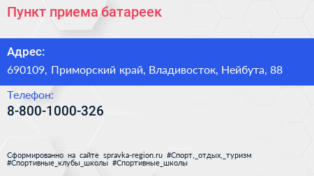 Пункт приема батареек по адресу 690109, Приморский край, Владивосток, Нейбута, 88 в дальнейшем Организация, размещена в следующих категориях: