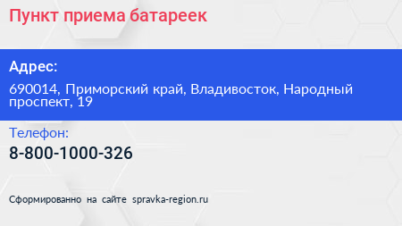 Пункт приема батареек по адресу 690014, Приморский край, Владивосток, Народный проспект, 19 в дальнейшем Организация, размещена в следующих категориях: