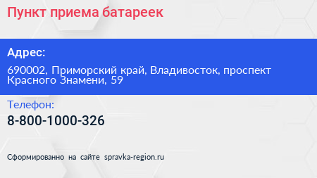 Пункт приема батареек по адресу 690002, Приморский край, Владивосток, проспект Красного Знамени, 59 в дальнейшем Организация, размещена в следующих категориях: