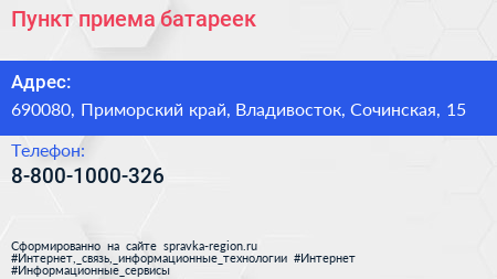 Пункт приема батареек по адресу 690080, Приморский край, Владивосток, Сочинская, 15 в дальнейшем Организация, размещена в следующих категориях: