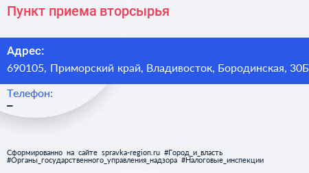Пункт приема вторсырья по адресу 690105, Приморский край, Владивосток, Бородинская, 30Б в дальнейшем Организация, размещена в следующих категориях: