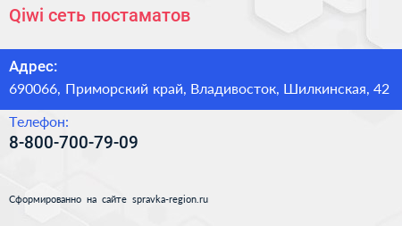 Qiwi, сеть постаматов по адресу 690066, Приморский край, Владивосток, Шилкинская, 42 в дальнейшем Организация, размещена в следующих категориях: