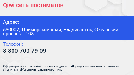 Qiwi, сеть постаматов по адресу 690002, Приморский край, Владивосток, Океанский проспект, 108 в дальнейшем Организация, размещена в следующих категориях: