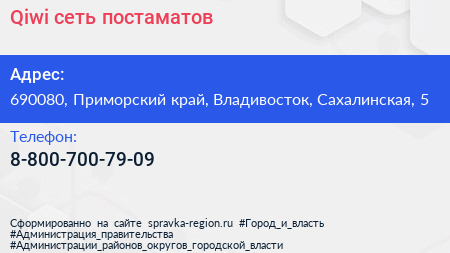 Qiwi, сеть постаматов по адресу 690080, Приморский край, Владивосток, Сахалинская, 5 в дальнейшем Организация, размещена в следующих категориях: