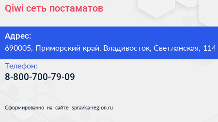 Qiwi, сеть постаматов по адресу 690005, Приморский край, Владивосток, Светланская, 114 в дальнейшем Организация, размещена в следующих категориях:
