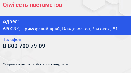 Qiwi, сеть постаматов по адресу 690087, Приморский край, Владивосток, Луговая, 91 в дальнейшем Организация, размещена в следующих категориях: