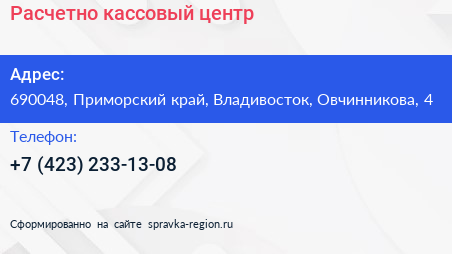 Расчетно-кассовый центр по адресу 690048, Приморский край, Владивосток, Овчинникова, 4 в дальнейшем Организация, размещена в следующих категориях: