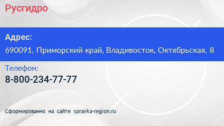 Русгидро по адресу 690091, Приморский край, Владивосток, Октябрьская, 8 в дальнейшем Организация, размещена в следующих категориях:
