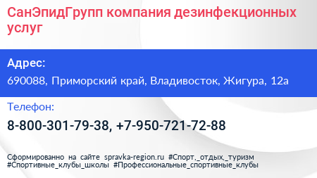 СанЭпидГрупп, компания дезинфекционных услуг по адресу 690088, Приморский край, Владивосток, Жигура, 12а в дальнейшем Организация, размещена в следующих категориях: