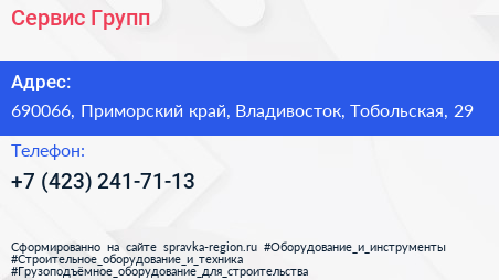 Сервис Групп по адресу 690066, Приморский край, Владивосток, Тобольская, 29 в дальнейшем Организация, размещена в следующих категориях:
