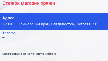 Стежок, магазин пряжи по адресу 690005, Приморский край, Владивосток, Луговая, 18 в дальнейшем Организация, размещена в следующих категориях: