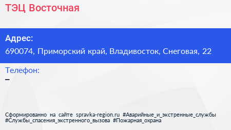 ТЭЦ Восточная по адресу 690074, Приморский край, Владивосток, Снеговая, 22 в дальнейшем Организация, размещена в следующих категориях: