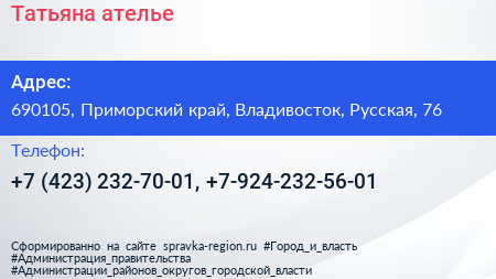 Татьяна, ателье по адресу 690105, Приморский край, Владивосток, Русская, 76 в дальнейшем Организация, размещена в следующих категориях:
