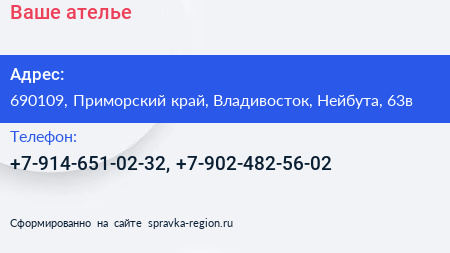Ваше ателье по адресу 690109, Приморский край, Владивосток, Нейбута, 63в в дальнейшем Организация, размещена в следующих категориях: