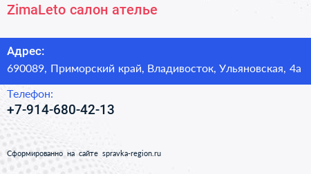 ZimaLeto, салон-ателье по адресу 690089, Приморский край, Владивосток, Ульяновская, 4а в дальнейшем Организация, размещена в следующих категориях: