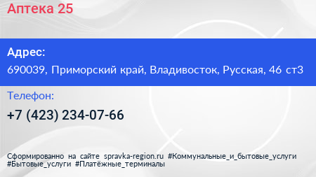 Аптека 25+ по адресу 690039, Приморский край, Владивосток, Русская, 46 ст3 в дальнейшем Организация, размещена в следующих категориях: