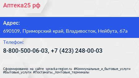 Аптека25.рф по адресу 690109, Приморский край, Владивосток, Нейбута, 67а в дальнейшем Организация, размещена в следующих категориях: