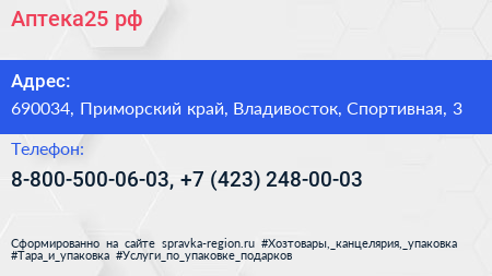Аптека25.рф по адресу 690034, Приморский край, Владивосток, Спортивная, 3 в дальнейшем Организация, размещена в следующих категориях: