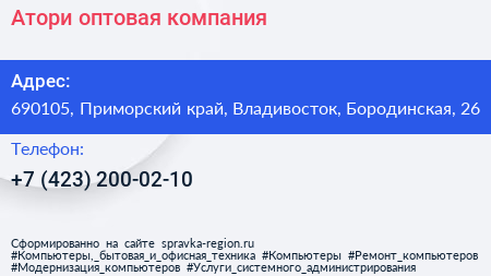 Атори, оптовая компания по адресу 690105, Приморский край, Владивосток, Бородинская, 26 в дальнейшем Организация, размещена в следующих категориях: