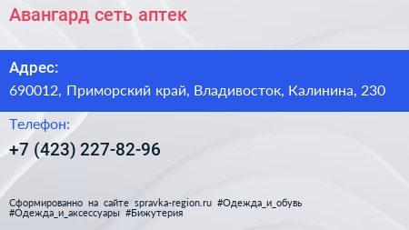 Авангард, сеть аптек по адресу 690012, Приморский край, Владивосток, Калинина, 230 в дальнейшем Организация, размещена в следующих категориях: