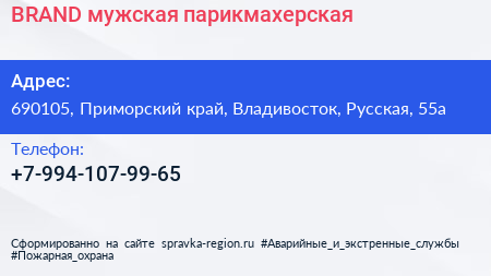 BRAND, мужская парикмахерская по адресу 690105, Приморский край, Владивосток, Русская, 55а в дальнейшем Организация, размещена в следующих категориях: