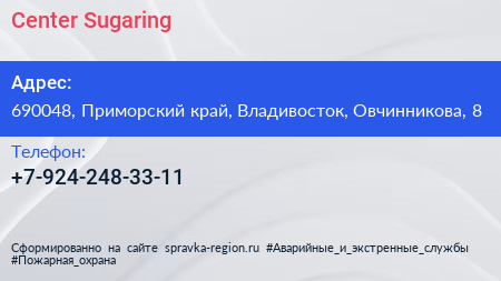 Center Sugaring по адресу 690048, Приморский край, Владивосток, Овчинникова, 8 в дальнейшем Организация, размещена в следующих категориях: