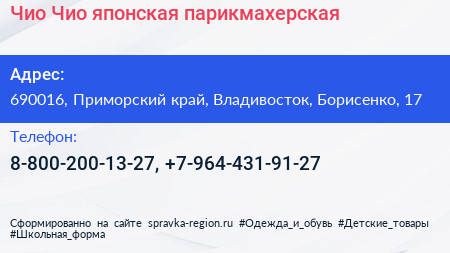 Чио Чио, японская парикмахерская по адресу 690016, Приморский край, Владивосток, Борисенко, 17 в дальнейшем Организация, размещена в следующих категориях: