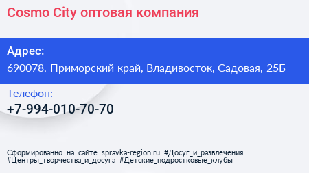 Cosmo City, оптовая компания по адресу 690078, Приморский край, Владивосток, Садовая, 25Б в дальнейшем Организация, размещена в следующих категориях: