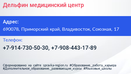 Дельфин, медицинский центр по адресу 690078, Приморский край, Владивосток, Союзная, 17 в дальнейшем Организация, размещена в следующих категориях: