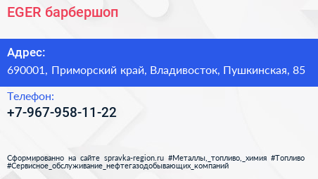 EGER, барбершоп по адресу 690001, Приморский край, Владивосток, Пушкинская, 85 в дальнейшем Организация, размещена в следующих категориях: