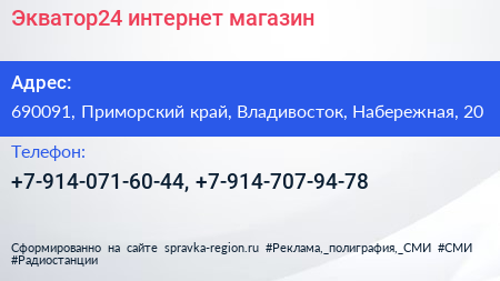 Экватор24, интернет-магазин по адресу 690091, Приморский край, Владивосток, Набережная, 20 в дальнейшем Организация, размещена в следующих категориях: