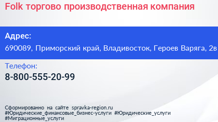 Folk, торгово-производственная компания по адресу 690089, Приморский край, Владивосток, Героев Варяга, 2в в дальнейшем Организация, размещена в следующих категориях: