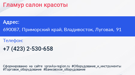 Гламур, салон красоты по адресу 690087, Приморский край, Владивосток, Луговая, 91 в дальнейшем Организация, размещена в следующих категориях: