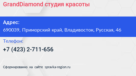 GrandDiamond, студия красоты по адресу 690039, Приморский край, Владивосток, Русская, 46 в дальнейшем Организация, размещена в следующих категориях: