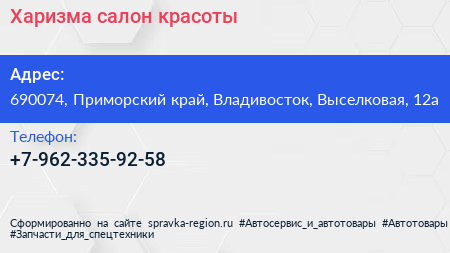 Харизма, салон красоты по адресу 690074, Приморский край, Владивосток, Выселковая, 12а в дальнейшем Организация, размещена в следующих категориях: