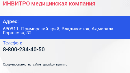 ИНВИТРО, медицинская компания по адресу 690911, Приморский край, Владивосток, Адмирала Горшкова, 32 в дальнейшем Организация, размещена в следующих категориях: