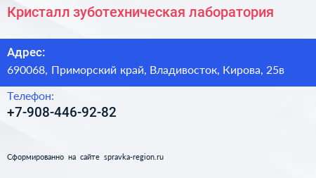 Кристалл, зуботехническая лаборатория по адресу 690068, Приморский край, Владивосток, Кирова, 25в в дальнейшем Организация, размещена в следующих категориях: