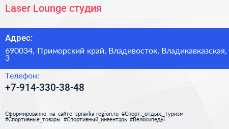 Laser Lounge, студия по адресу 690034, Приморский край, Владивосток, Владикавказская, 3 в дальнейшем Организация, размещена в следующих категориях: