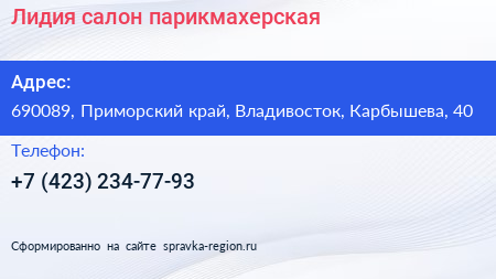Лидия, салон-парикмахерская по адресу 690089, Приморский край, Владивосток, Карбышева, 40 в дальнейшем Организация, размещена в следующих категориях:
